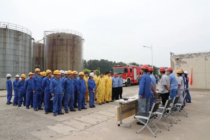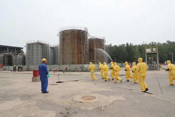 演练假定华腾天海罐区甲醇发生泄漏并引发火灾。在演练中,干部职工信息沟通流畅,现场处置有序,分工明确。处置过程中应急救援人员沉着冷静,现场处置移交顺利,及时扑救了“甲醇火灾事故”,消除了“火灾事故”扩大带来的更大危险。